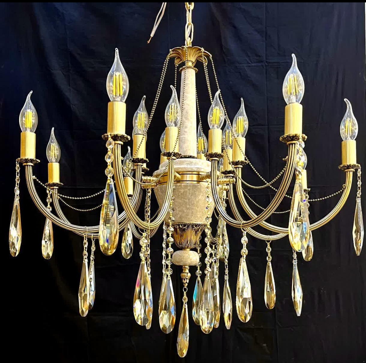 لوستر 6 شاخه 12 شعله برنجی برنزی سنگی با آویز سنگی و غلاف طرحدار