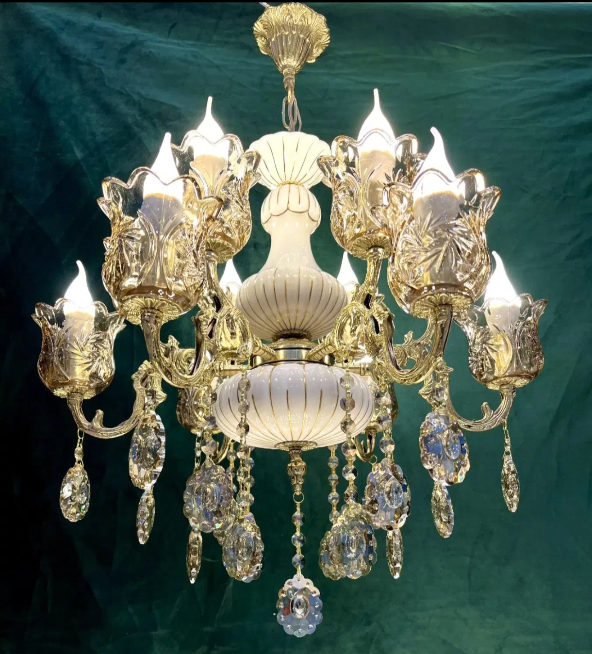لوستر 6 شاخه 12 شعله برنجی برنزی سرامیکی خطی با لاله و آویز