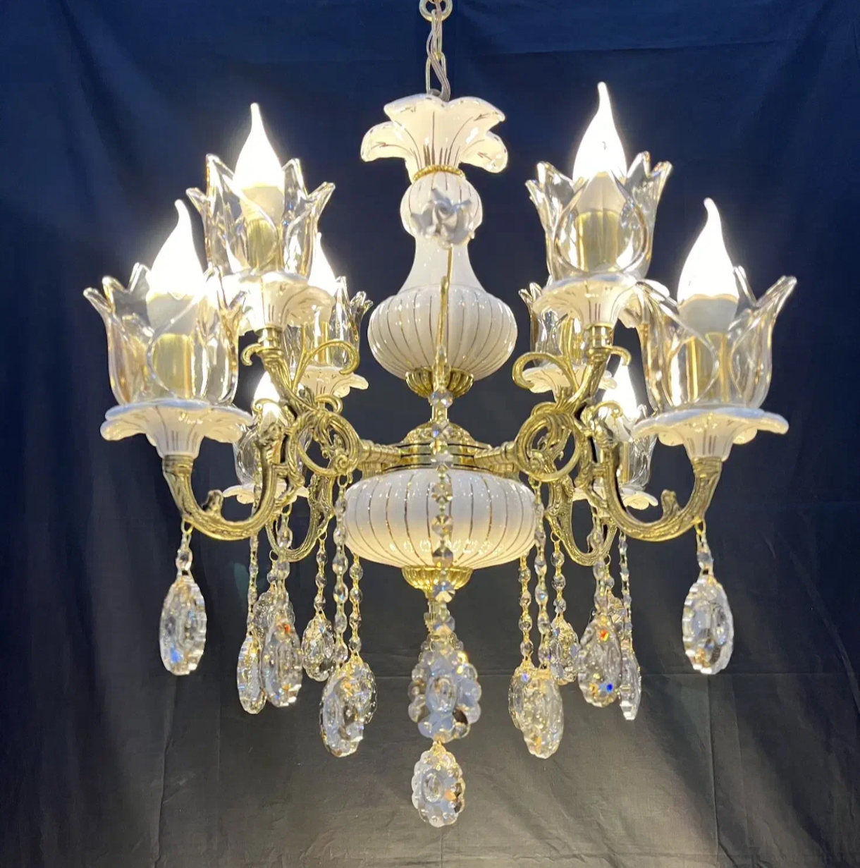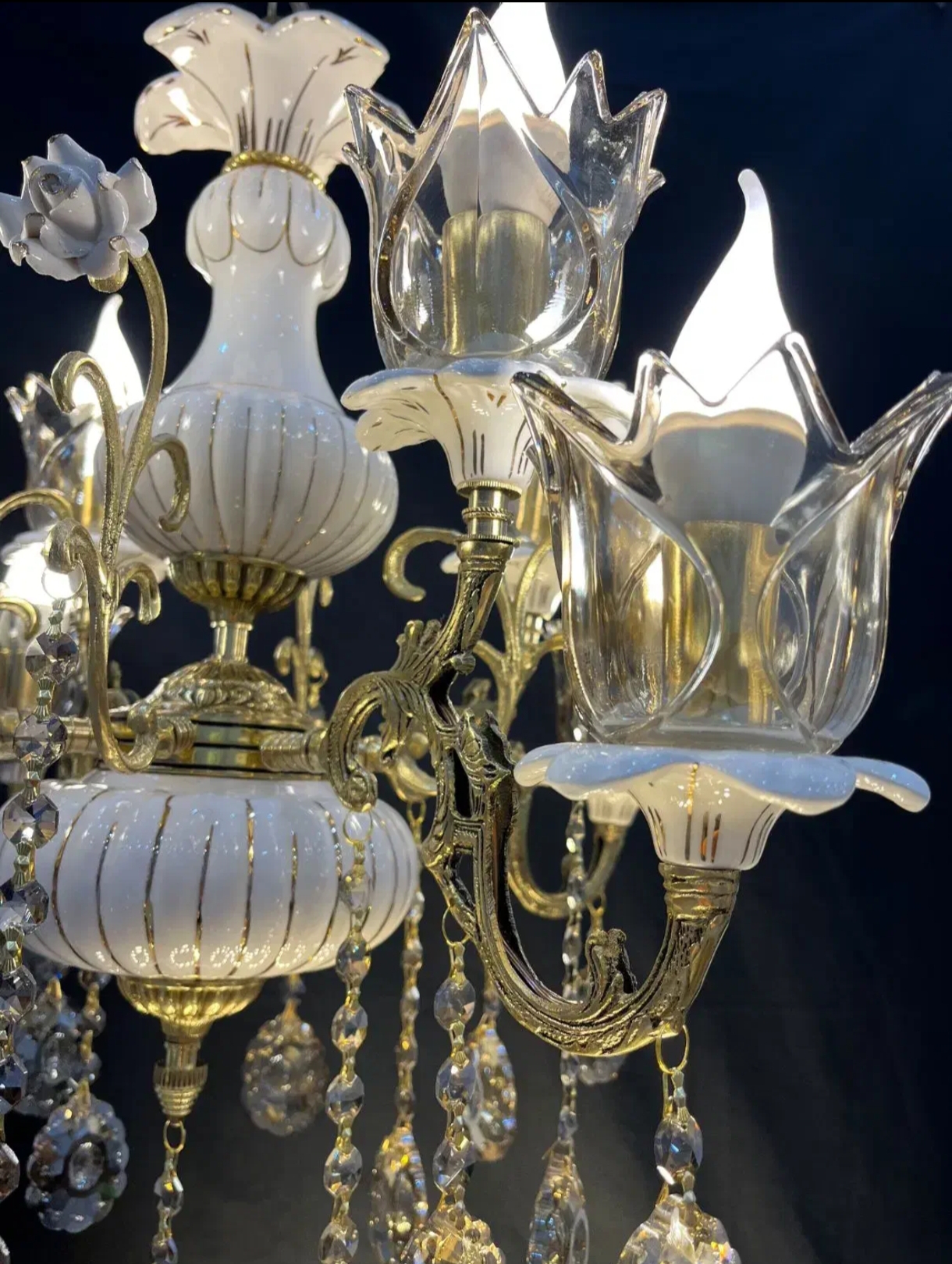 لوستر 4 شاخه 8 شعله برنجی برنزی سرامیکی خطی شاخک گلدار با لاله و آویز