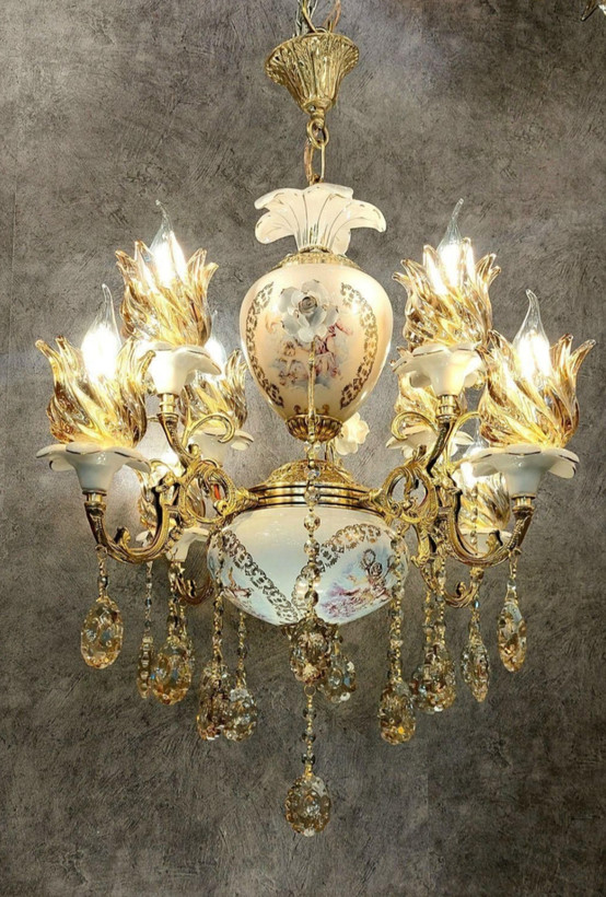 لوستر 4 شاخه 8 شعله برنجی برنزی سرامیکی لیلی مجنون با شاخک گلدار با لاله و آویز