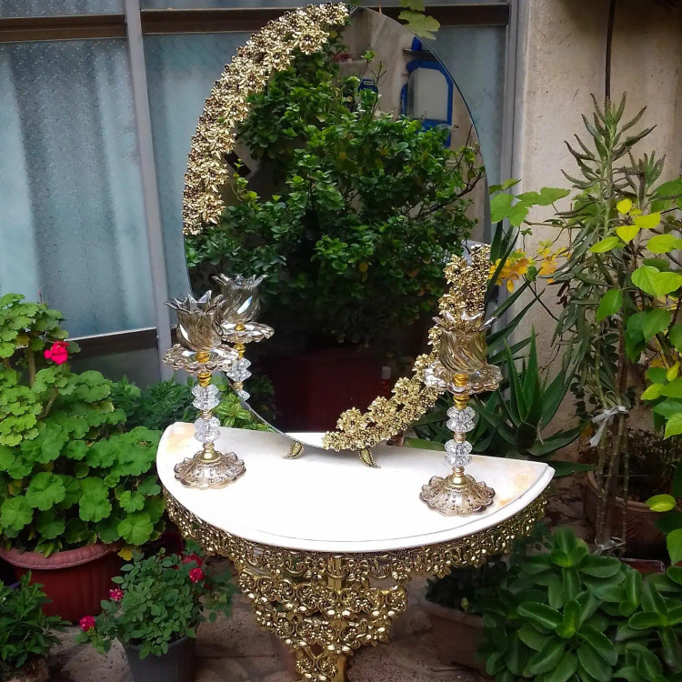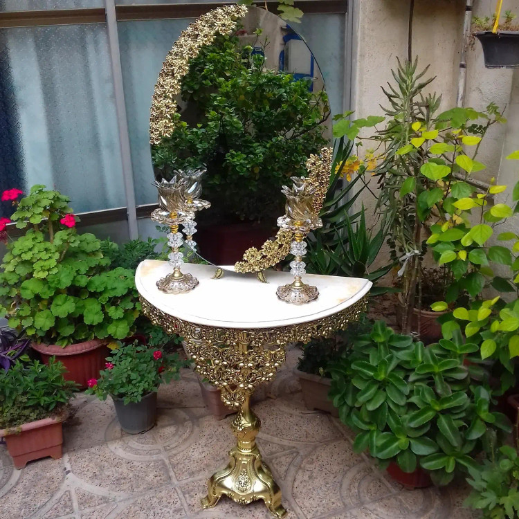 اندازهسایز آیینه 70×50 , ارتفاع میز 70 ، شمعدان 34 سانت