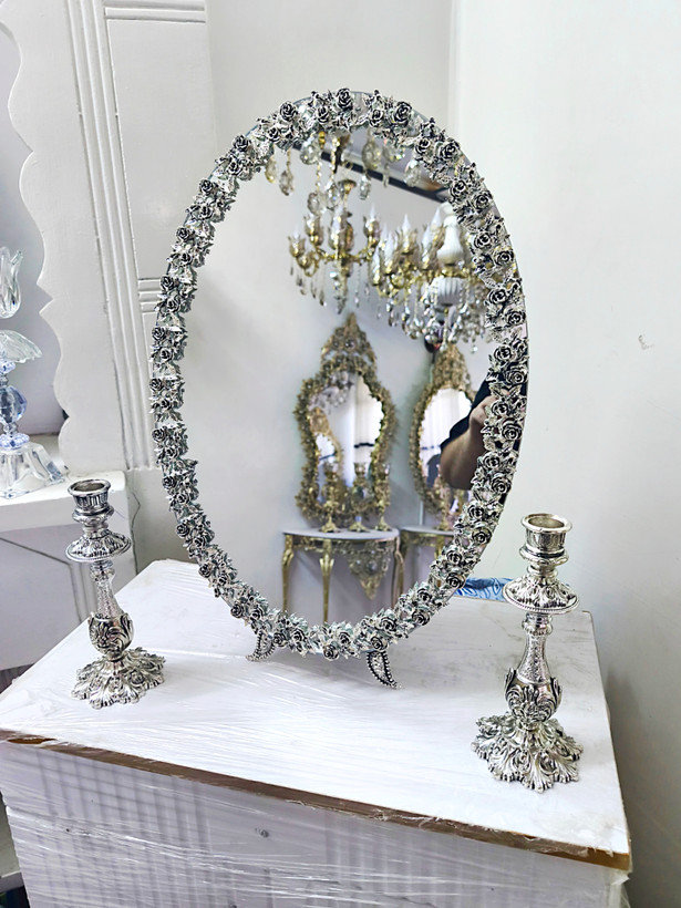 سرویس آیینه و شمعدان عقد و عروس , آینه سایز 50 مدل گل رز روکش نقره