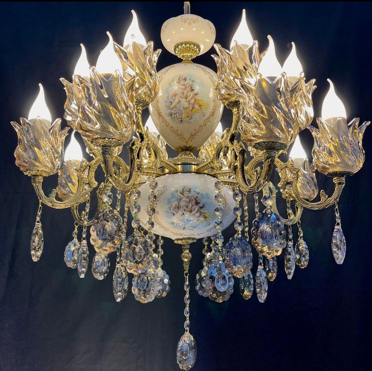 لوستر 8 شاخه 16 شعله برنجی برنزی سرامیکی لیلی مجنون با لاله و آویز