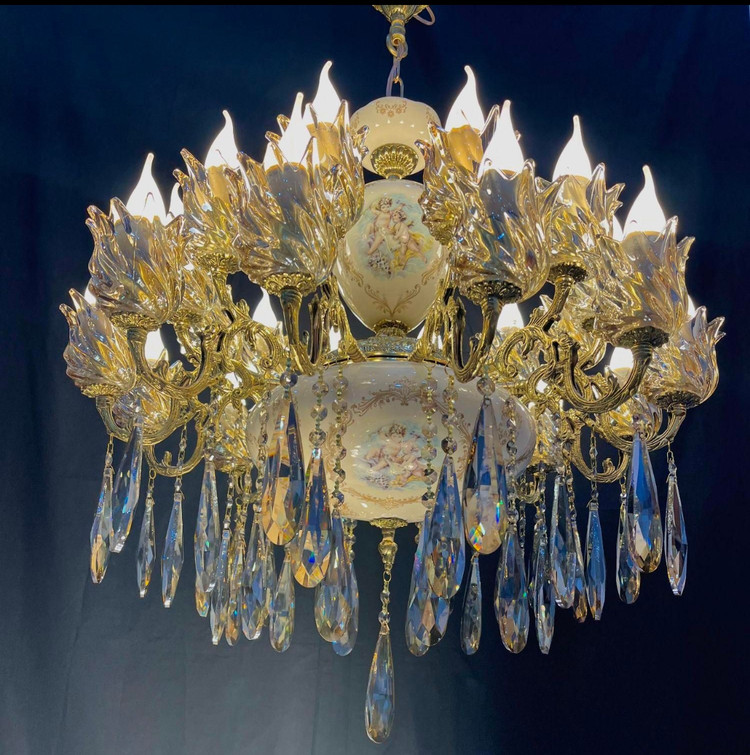 لوستر 12 شاخه 24 شعله برنجی برنزی سرامیکی لیلی مجنون با لاله و آویز