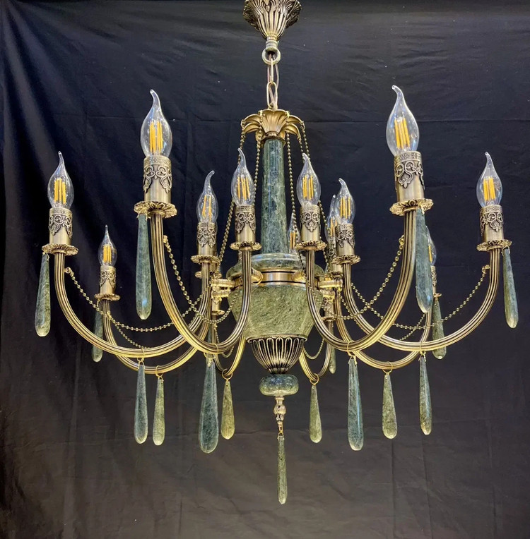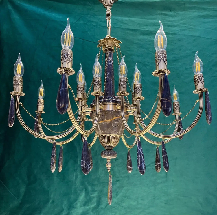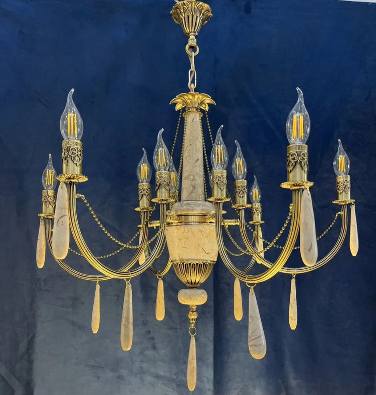 لوستر 6 شاخه 12 شعله برنجی برنزی سنگی با آویز سنگی و غلاف طرحدار