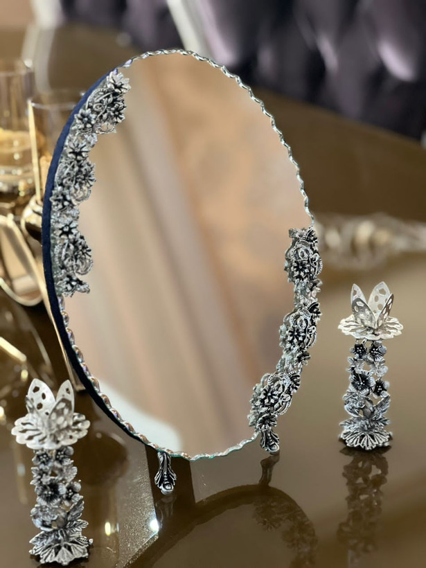 سرویس آیینه و شمعدان مناسب هفت سین و بله برون و نامزدی و سیسمونی گل مینا روکش نقره رنگ ثابت تضمینی سایز آیینه 32×22 شمعدان 12 سانت ، ارسال به تمام نقاط ایران ، تحویل آنی در تهران و کرج ، تحویل ۲ روزه در شهرستان ها ، امکان مراجعه حضوری به کارگاه