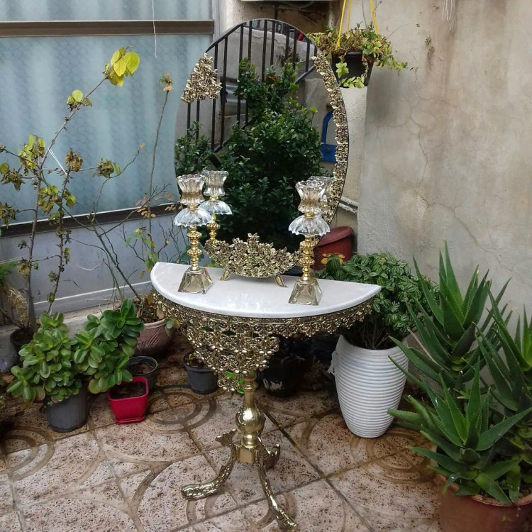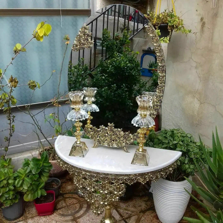 اندازه: سایز آیینه 70×50 ، ارتفاع میز 70 ، شمعدان 35 سانت