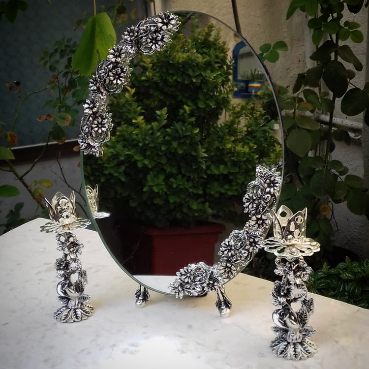 آینه و شمعدان بله برون و هفت سین ، آیینه گل مینا روکش نقره