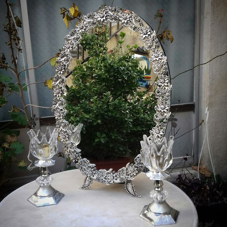 آیینه و شمعدان عقد و عروس ، آینه سایز 45 مدل گل رز روکش نقره