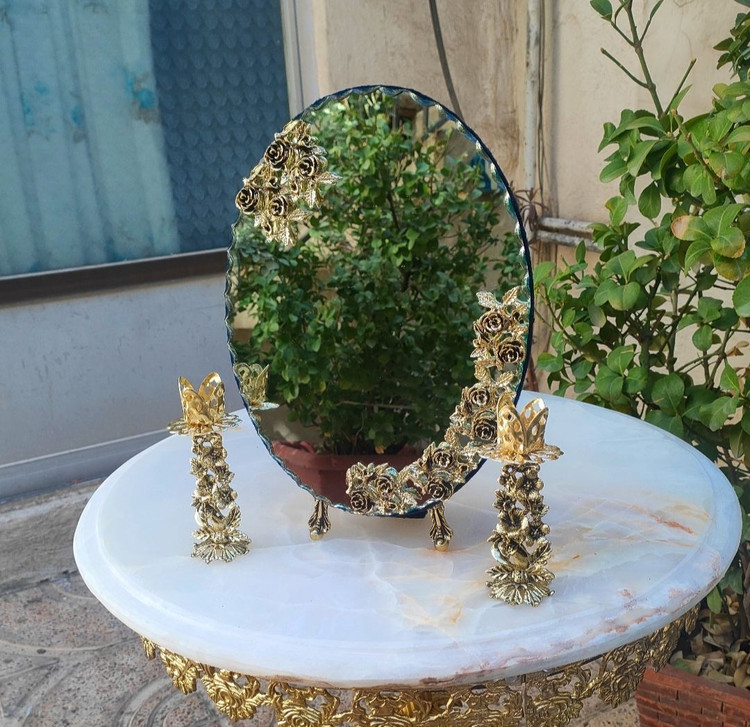 آینه و شمعدان بله برون و نامزدی و هفت سین ، آیینه مدل گل رز طلایی طرح برنز