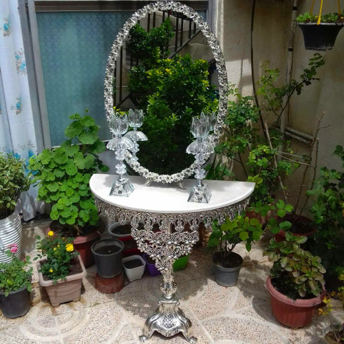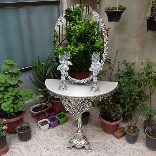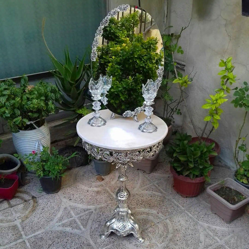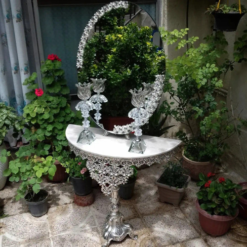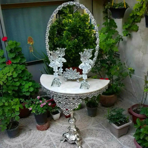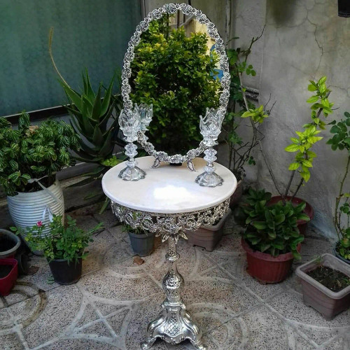 سرویس کامل آیینه و شمعدان و میز عروس ، اینه مدل گل مینا روکش نقره