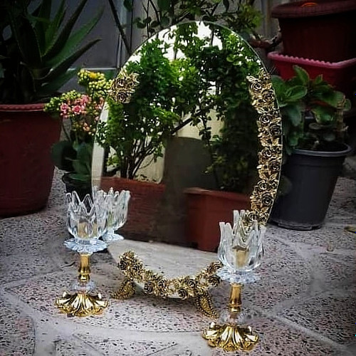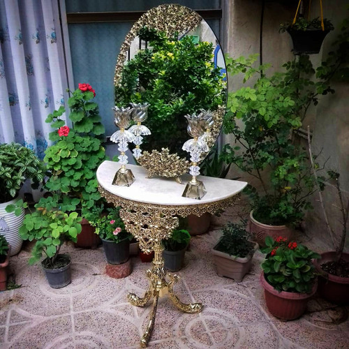سرویس کامل آیینه و شمعدان و میز عروس ، اینه مدل گل برگی طرح برنز