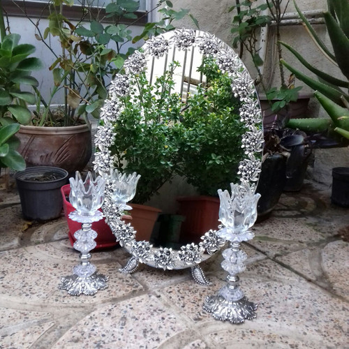 ایینه و شمعدان عروس ، اینه مدل گل مینا نقره ای روکش نقره