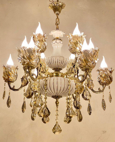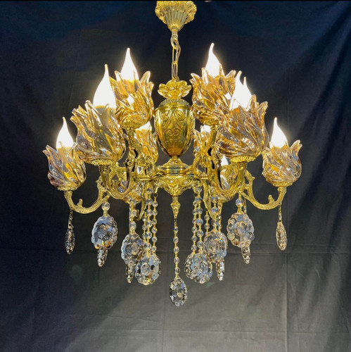لوستر 12 شاخه 24 شعله تمام برنجی برنزی با لاله و آویز