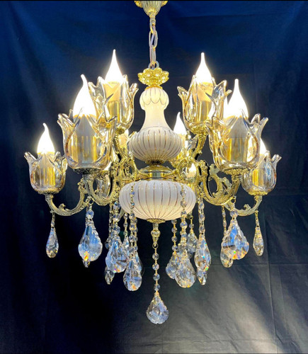 لوستر 6 شاخه 12 شعله تمام برنجی برنزی با لاله و آویز