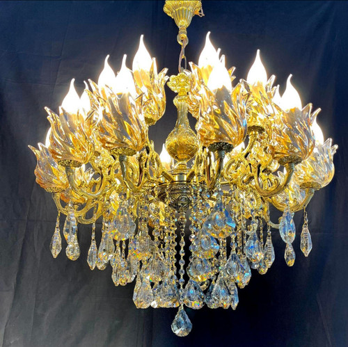 لوستر 15 شاخه 30 شعله تمام برنجی برنزی با لاله و آویز